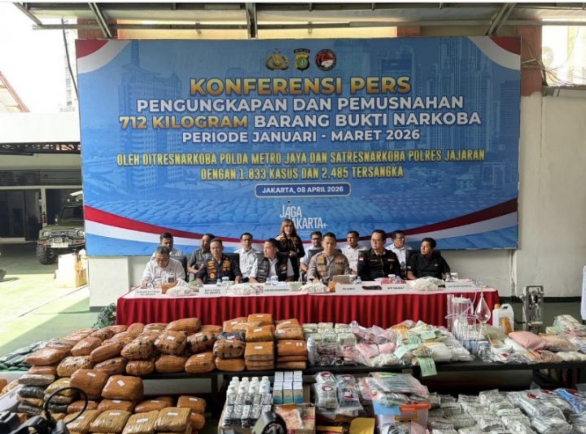 “Selama kurun waktu 3 bulan terakhir, kita telah menyita barang bukti narkoba sebanyak 712,01 kilogram,” jelas Kombes David saat konferensi pers di Lapangan Ditresnarkoba Polda Metro Jaya, Jakarta Selatan, Rabu (8/4/2026).